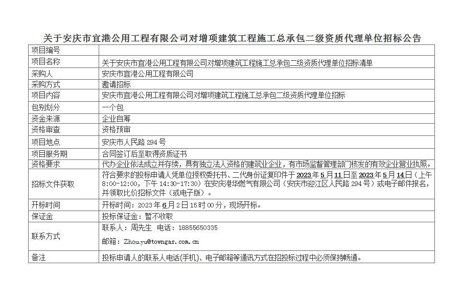 關(guān)于安慶市宜港公用工程有限公司對(duì)增項(xiàng)建筑工程施工總承包二級(jí)資質(zhì)代理單位招標(biāo)公告