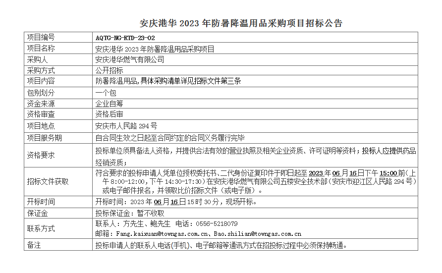 安慶港華2023年防暑降溫用品采購(gòu)項(xiàng)目招標(biāo)公告