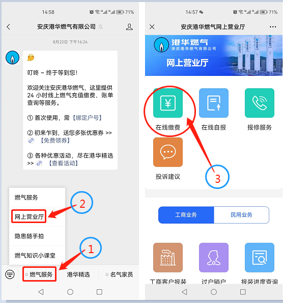 微信公眾號:關(guān)注我公司微信公眾號“安慶港華燃?xì)庥邢薰尽保c(diǎn)擊“燃?xì)夥?wù)”-“網(wǎng)上營業(yè)廳”,在網(wǎng)上營業(yè)廳中選擇“在線繳費(fèi)”,即可繳納燃?xì)赓M(fèi)或者預(yù)存氣費(fèi)。