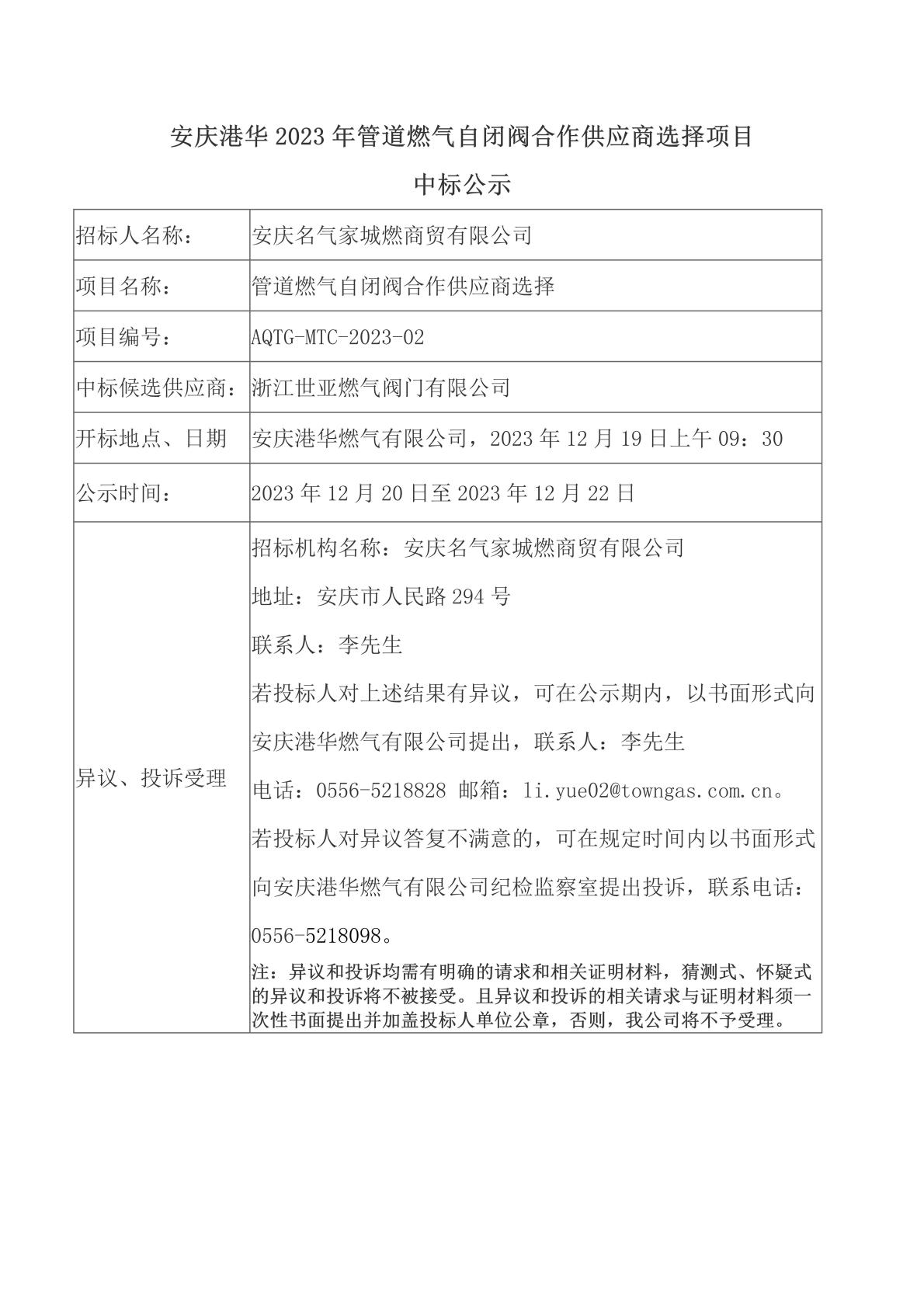 中標公示(安慶港華2023年管道燃氣自閉閥合作供應(yīng)商選擇項目)