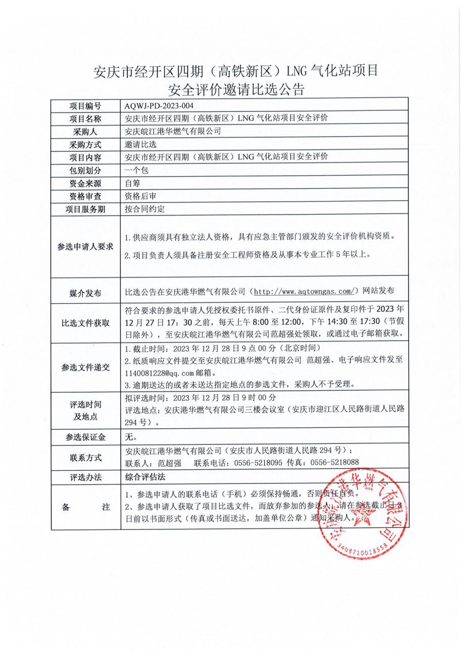 安慶經(jīng)開區(qū)四期(高鐵新區(qū))LNG氣化站安全評價邀請比選文件