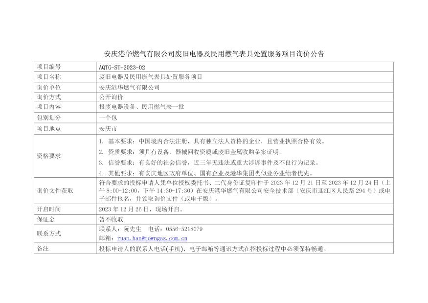安慶港華燃?xì)庥邢薰緩U舊電器及民用燃?xì)獗砭咛幹梅?wù)項(xiàng)目詢價(jià)公告