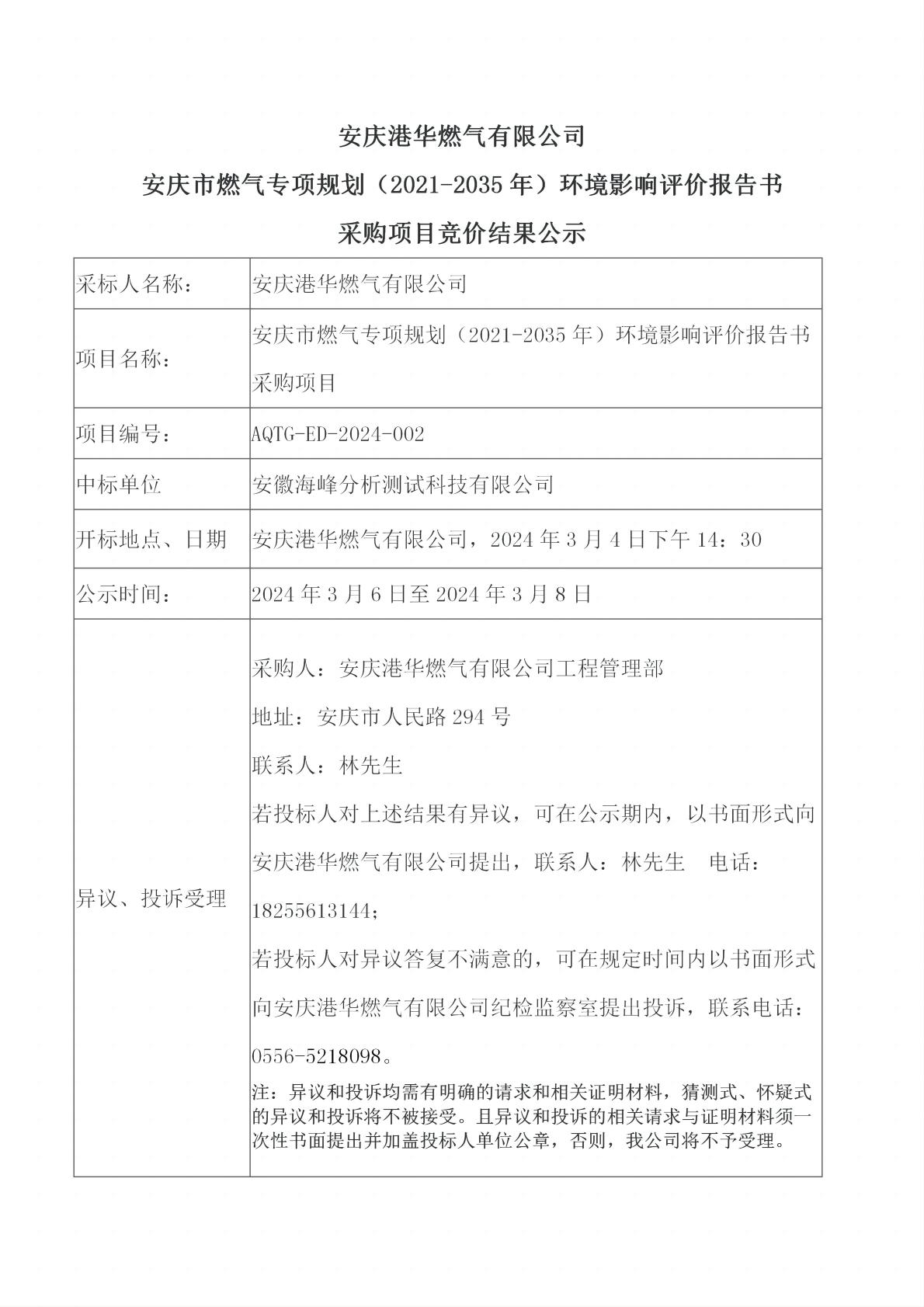 安慶港華燃?xì)庥邢薰?安慶市燃?xì)鈱m?xiàng)規(guī)劃(2021-2035年)環(huán)境影響評價(jià)報(bào)告書采購項(xiàng)目競價(jià)結(jié)果公示