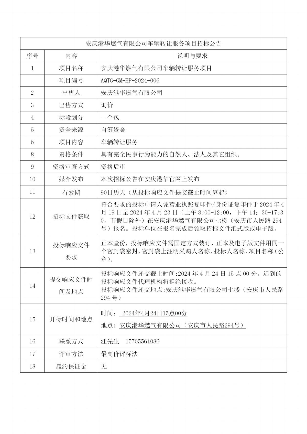 安慶港華燃?xì)庥邢薰拒囕v轉(zhuǎn)讓服務(wù)項(xiàng)目招標(biāo)公告