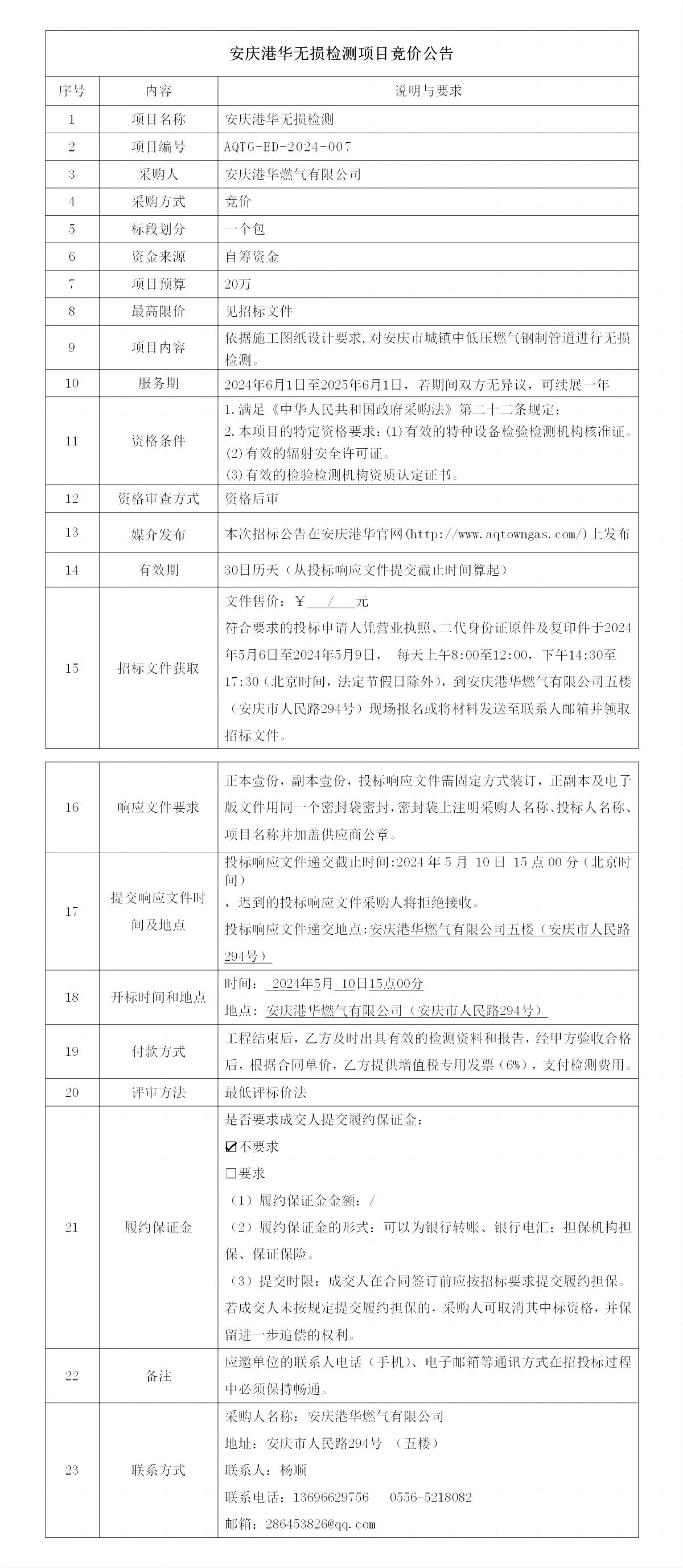 安慶港華無損檢測(cè)項(xiàng)目競(jìng)價(jià)公告