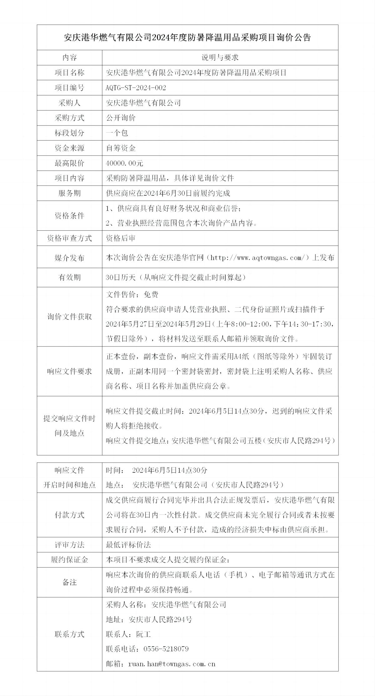 安慶港華燃?xì)庥邢薰?024年度防暑降溫用品采購項(xiàng)目詢價(jià)公告