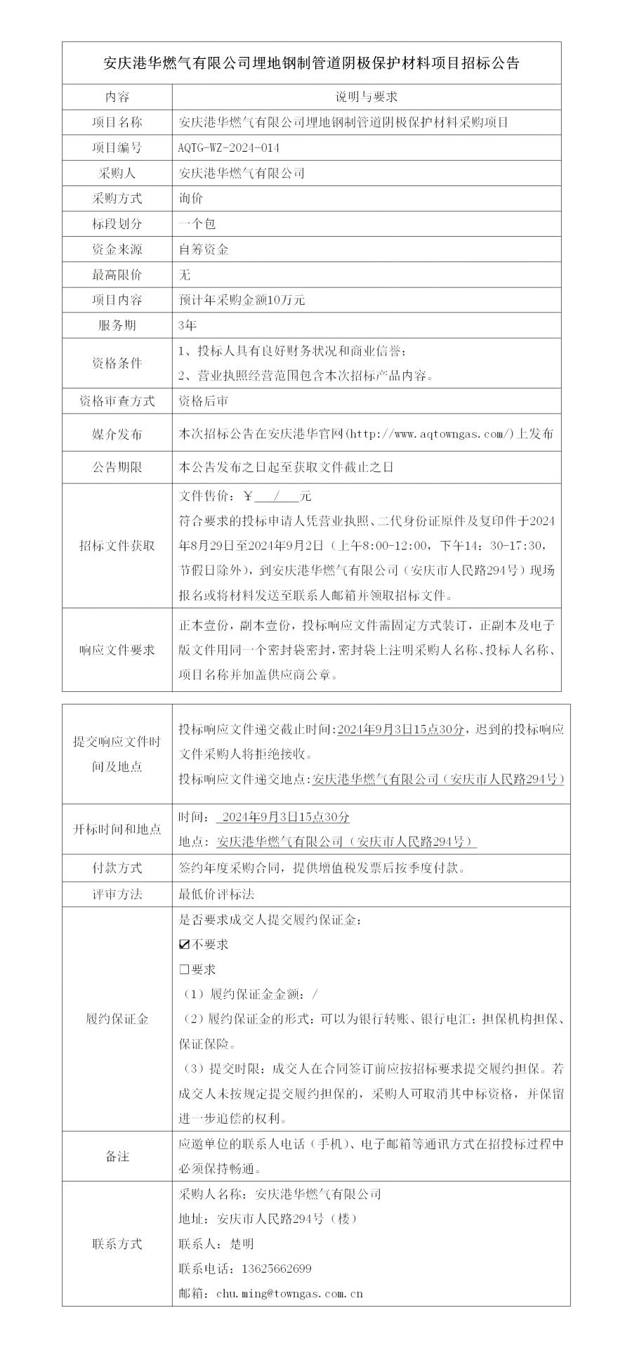 安慶港華燃氣有限公司埋地鋼制管道陰極保護材料項目招標公告