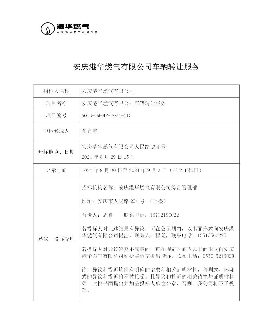 安慶港華燃?xì)庥邢薰拒囕v轉(zhuǎn)讓服務(wù)項(xiàng)目中標(biāo)公示