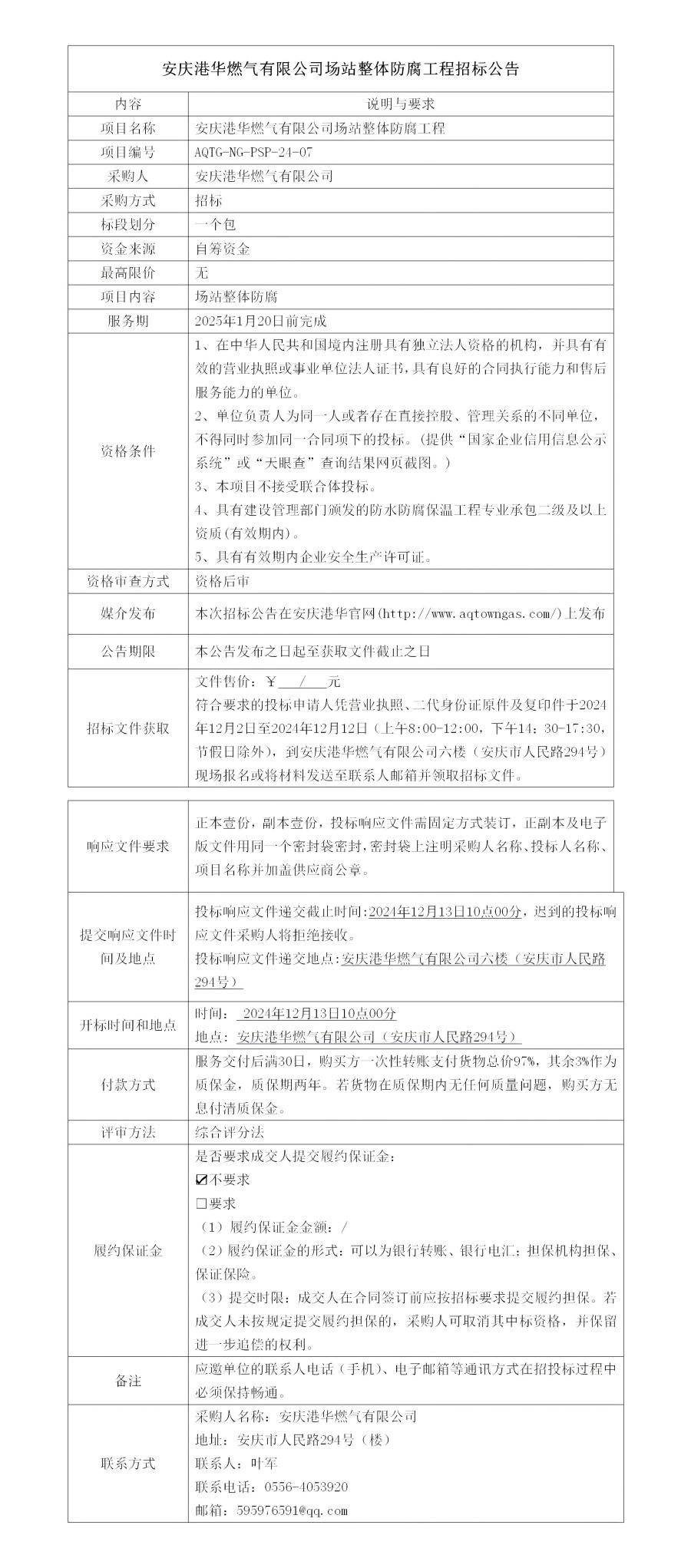 安慶港華燃?xì)庥邢薰緢?chǎng)站整體防腐工程招標(biāo)公告