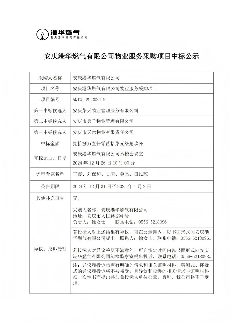 安慶港華燃?xì)庥邢薰疚飿I(yè)服務(wù)采購項目中標(biāo)公示