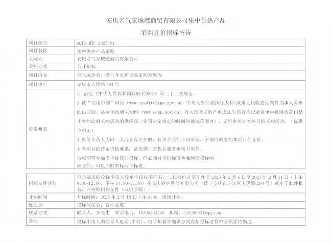 安慶名氣家城燃商貿(mào)有限公司集中供熱產(chǎn)品采購競價招標(biāo)公告