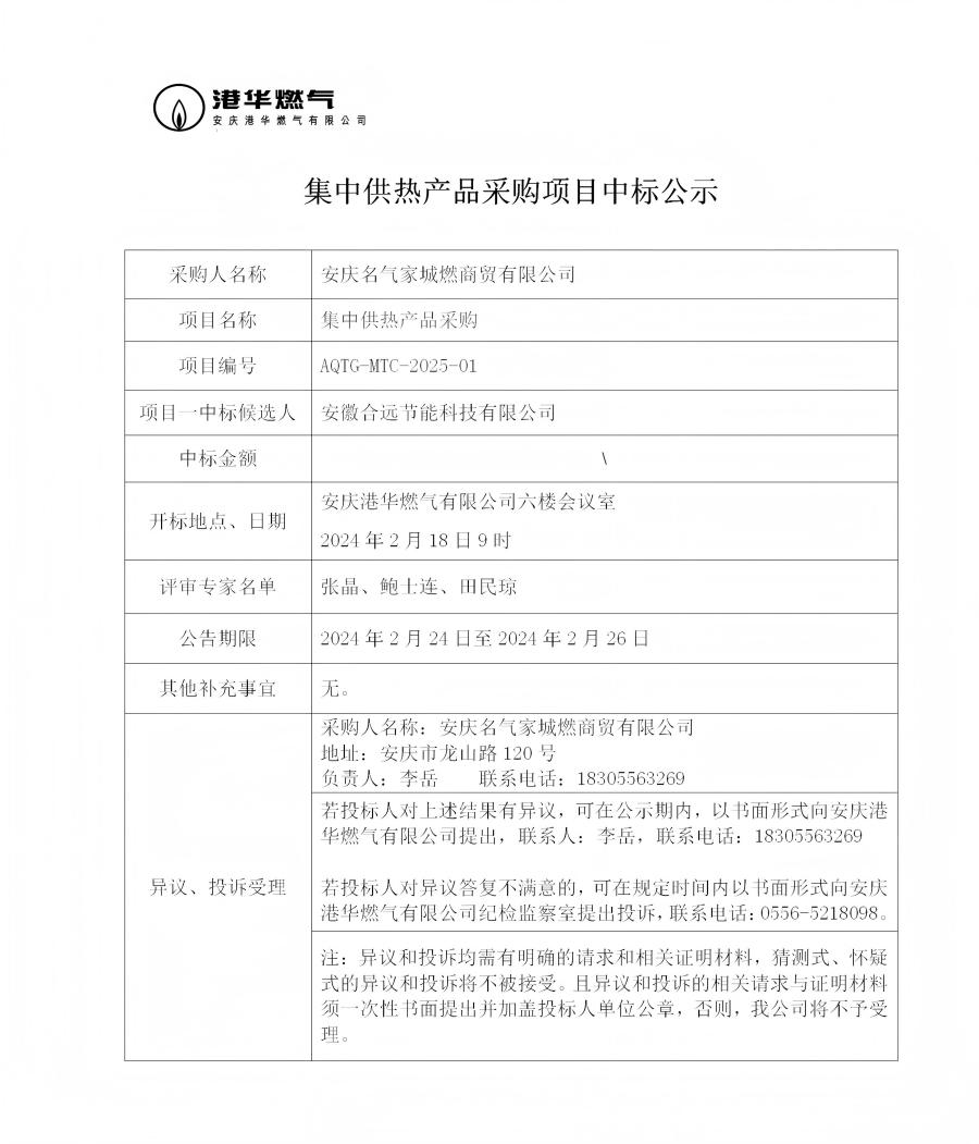 集中供熱產(chǎn)品采購項(xiàng)目中標(biāo)公示