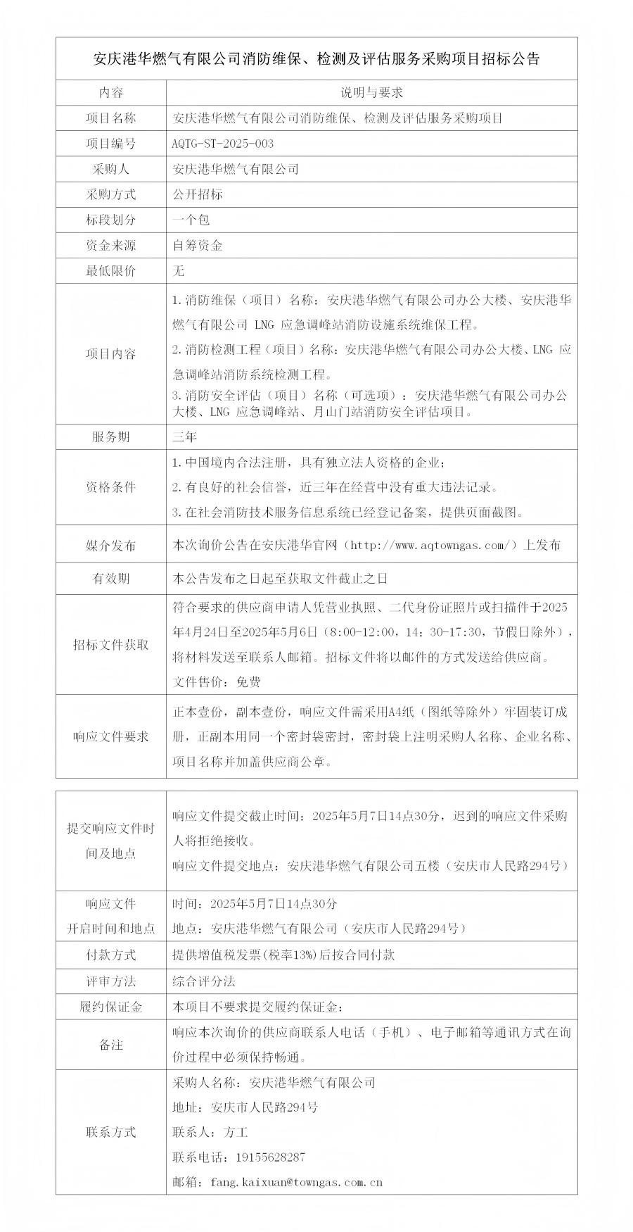 安慶港華燃氣有限公司消防維保、檢測及評估服務(wù)采購項目招標公告