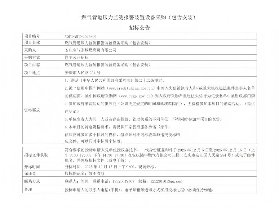 燃氣管道壓力監(jiān)測報警裝置設備采購(包含安裝)招標公告