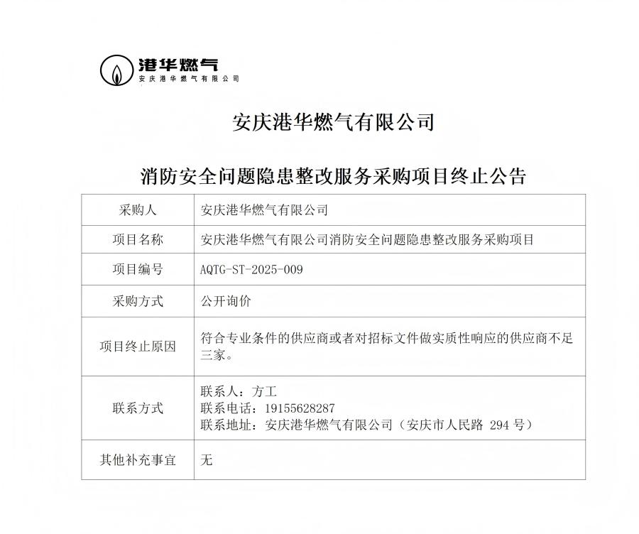 安慶港華燃?xì)庥邢薰鞠腊踩珕栴}隱患整改服務(wù)采購項目終止公告