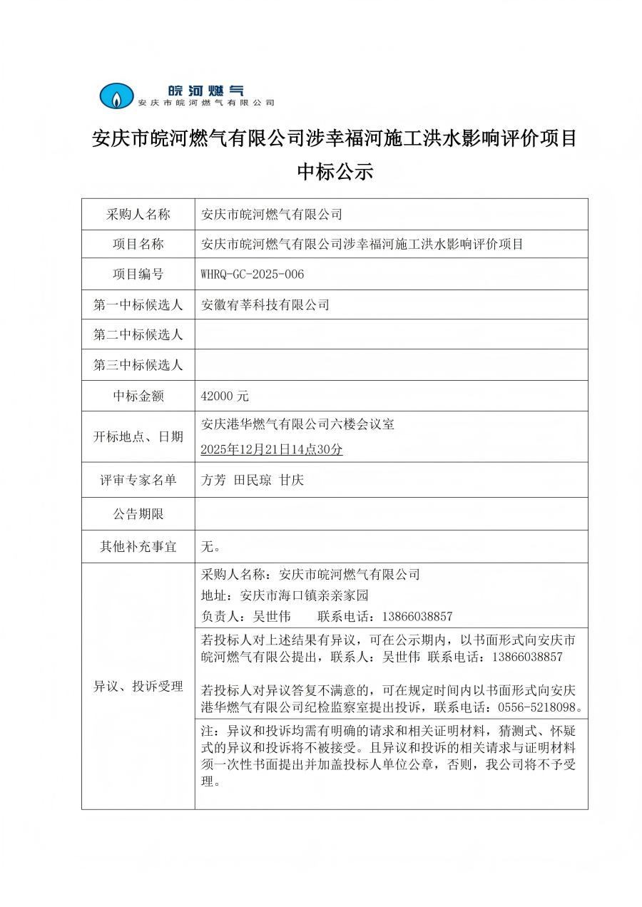 安慶市皖河燃?xì)庥邢薰旧嫘腋:邮┕ず樗绊懺u(píng)價(jià)項(xiàng)目中標(biāo)公示