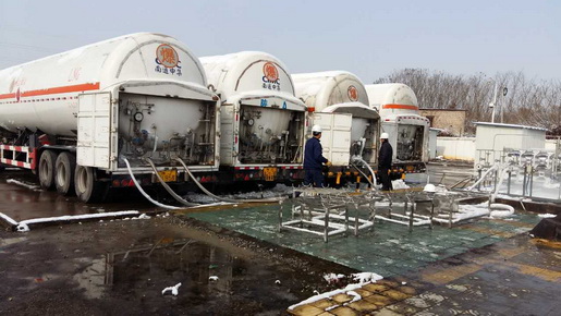 圖為1月23日,LNG釋放站工作人員在進(jìn)行儲(chǔ)罐倒罐作業(yè)、清掃積雪